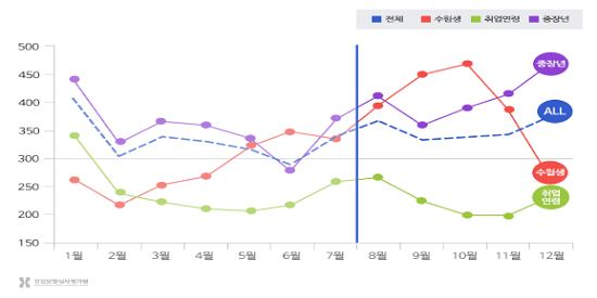 연령 구간별로 진료 인원이 많아지는 기간의 차이가 있었다. 수험생은 수능 전·취업 연령층은 연초, 중·장년층은 연말 등 진료 인원이 많아지는 시기 차이를 보였다.