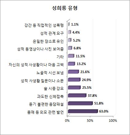 유형별로 묶어보면 음란한 농담 등 ‘언어적 행위’(78.6%)가 가장 많았고 신체적 접촉 등 ‘육체적 행위’는 17%, 외설적 사진을 보여주거나 노출시키는 등의 ‘시각적 행위’는 4.4%였다.