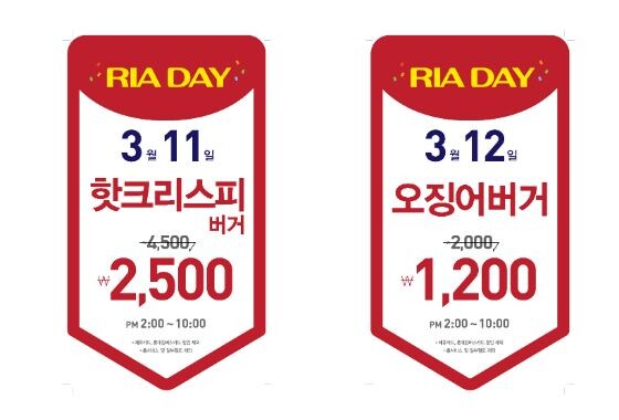 롯데리아 리아데이는 매월 특정일을 선정해 리아데이를 운영하고 있다. 리아데이는 매월 8시간 운영에도 불구하고 제품별 평균 40만개 이상의 판매를 기록하는 등 소비자들에게 많은 관심을 받고 있는 이벤트로 자리 잡고 있다.