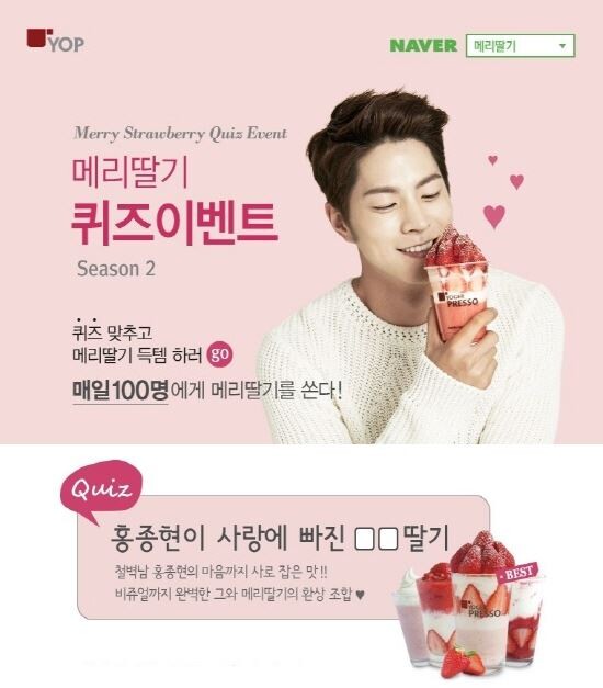 오는 15일까지 진행되는 이번 이벤트는 요거프레소 공식홈페이지와 포털싸이트 네이버의 메인 페이지에 등장하는 요거프레소 베너를 클릭해 참여가 가능하며 요거프레소의 전속모델 홍종현이 좋아하는 딸기 메뉴와 관련한 간단한 퀴즈를 풀면 자동 응모된다.