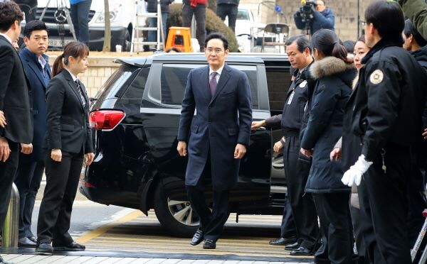 ▲ 박근혜 대통령에게 뇌물을 제공한 혐의 등을 받는 삼성전자 이재용 부회장이 18일 오전 영장 실질심사를 받기 위해 서울 서초동 서울중앙지법에 도착하고 있다. <사진=연합뉴스>