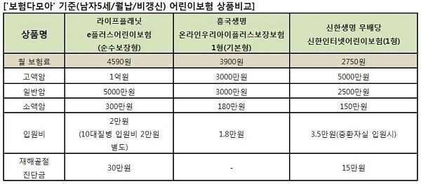 교보라이프플래닛생명보험의 '(무)라이프플래닛e플러스어린이보험(순수보장형)'은 월 5000원 정도의 보험료로 어린이 주요 10대 질병을 보장하고 고액의 치료비가 소요되는 백혈병, 골수암의 경우 최대 1억원, 일반암은 최대 5000만원까지 보장한다. 어린이들이 자주 당하는 골절사고 발생 시 1회 30만원을 지급한다. 신한생명의 ‘(무)신한인터넷어린이보험(프리미엄)’은 보장기간을 100세까지 설정할 수 있고 암·재해·입원·수술·골절 보장 외에도 유괴, 납치 위로금도 보장받을 수 있다. 흥국생명의 ‘(무)우리아이플러스보장보험’은 각종 질병, 재해, 암 진단, 수술, 입원 등을 폭넓게 보장하며 대면채널 대비 보험료가 20~30% 가량 저렴하다.