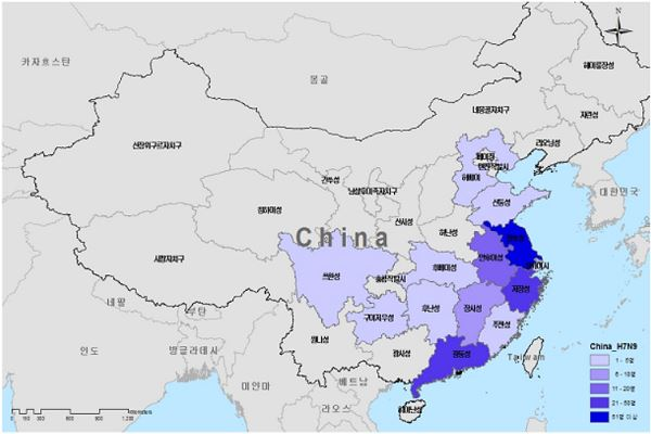 올 1월 기준 중국 내 AI 인체감염 발생지역은 장쑤성(58명), 저장성(23명), 광둥성(22명), 안후이성(14명), 장시성(7명), 푸젠성(4명), 구이저우성·후난성(3명), 산둥성(2명), 상하이·쓰촨성·허베이성·후베이성(1명) 등이다.
