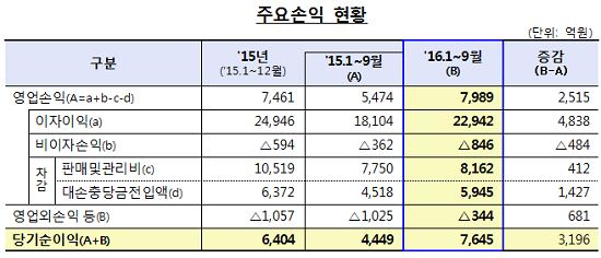 22일 금융감독원에 따르면 국내 79곳의 저축은행이 올해 1월부터 9월까지의 순이익이 7645억원으로 지난해 같은 기간보다 3196억원 증가했다.