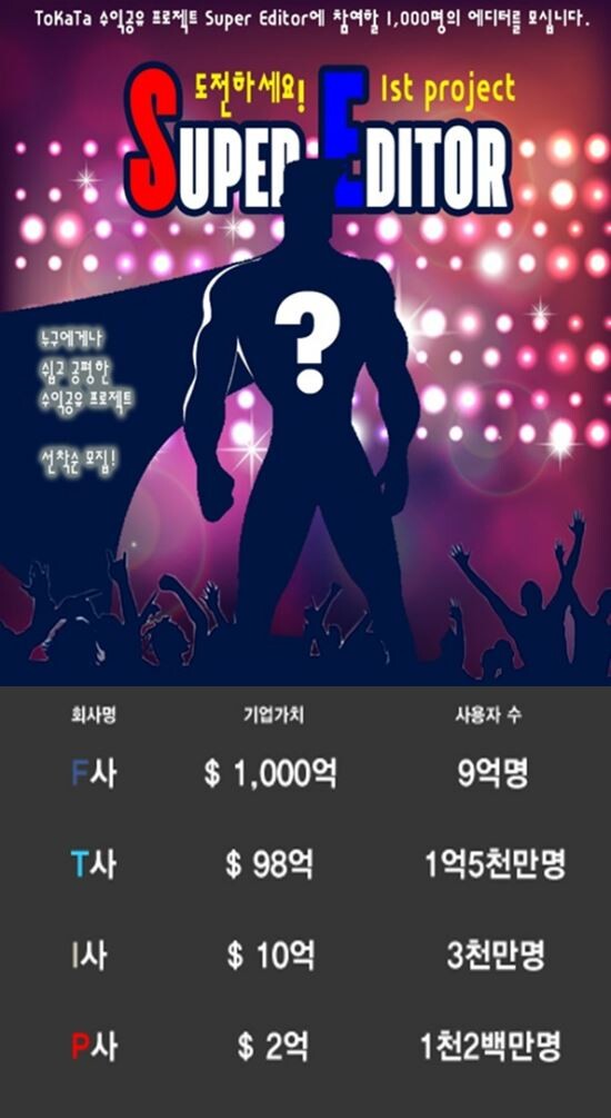 [토요경제=홍승우 기자] 팬클럽 커뮤니티 서비스 ‘ToKaTa(또까타)’에서 첫 번째 수익공유 프로젝트 슈퍼에디터 프로그램을 시작했다. 또까타는 수많은 SNS서비스가 수 조원에 이르는 천문학적인 가치를 내고 있는 SNS시장에 이러한 가치와 수익을 사용자들과 함께 나누겠다는 ‘착한 SNS 서비스’이다. 관계와 콘텐츠를 넘어 함께 수익을 공유할 수 있도록 플랫폼 서비스를 제시하는 수익공유 SNS인 것이다.