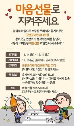 ‘마음 선물’은 어린이 등하굣길 안전을 생각하는 엄마의 마음을 담은 교통사고 예방용 선물로, 어린이들이 우산을 쓰고도 시야를 확보할 수 있는 투명우산과 어두운 거리에서 차량 불빛을 반사해 운전자에게 보행자를 인식시켜 주는 교통안전 반사경으로 구성돼 있다.