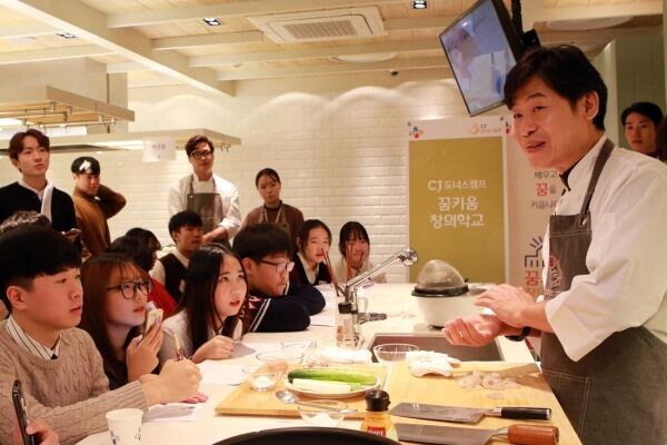 CJ그룹은 서울 중구에 위치한CJ제일제당센터 백설요리원에서 꿈키움창의학교 요리부문 청소년 및 대학생 멘토 50여명이 모인 가운데 ‘이연복 셰프와 함께하는 CJ도너스캠프 꿈키움 요리교실’을 진행했다고 25일 밝혔다. 사진은 이연복 셰프가 학생들에게 강의하는 모습. <사진=CJ>