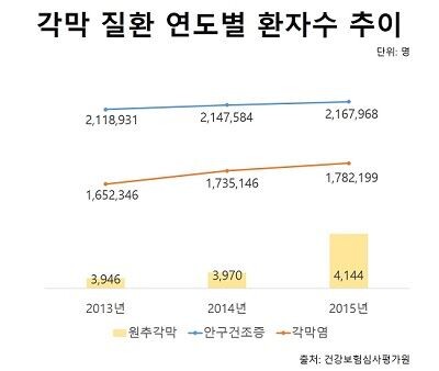 1일 건강보험심사평가원에 따르면 안구건조로 인한 진료 인원은 2013년 211만8931명에서 2015년 216만7968명으로 3년 새 약 5만명 증가한 것으로 나타났으며 각막염으로 인한 진료 인원은 2013년 165만2346명에서 2015년 178만2199으로 약 12만명 증가한 것으로 분석됐다.