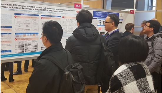 발표에 따르면 HM95573은 B-RAF 또는 RAS 변이 흑색종, 대장암 및 비소세포성 폐암 세포주를 이식한 동물모델에서 단독 또는 병용요법을 통해 항암효과를 나타냈다.