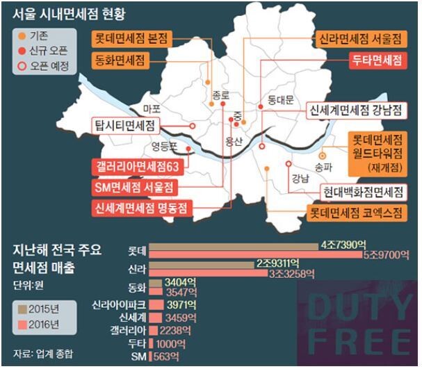 2017년 서울 시내면세점은 10곳이 운영중이며 앞으로 문을 열 면세점까지 합치면 홀해 총 13곳이다.