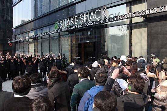 서울 도산대로에 오픈한 쉐이크쉑 2호점 청담점에 소비자들이 줄을 서서 입장을 기다리고 있다.
