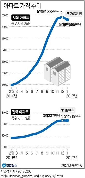 5일 KB국민은행 주택가격동향조사 결과를 보면 1월 전국 아파트 중위가격은 3억319만원으로 전월인 2016년 12월 3억337만원보다 18만원 떨어졌다.