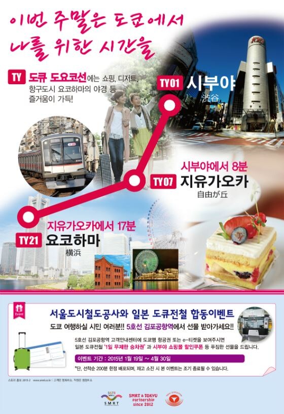 지하철 5~8호선을 운영하는 서울도시철도공사(사장 김태호)는 오는 19일(월)부터 4월 30일(목)까지 일본 민간 철도운영기관인 도큐전철과 함께 기념품 증정 이벤트를 벌인다고 밝혔다.
