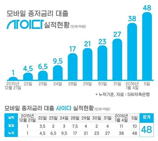 이는 현재 시중은행에서 운영 중인 대표적인 모바일 중금리대출 상품의 초기 10영업일 실적으로 알려진 13억6000만원의 3배가 넘는 규모다.