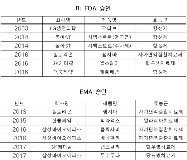 미국에서 허가받은 국산 의약품은 셀트리온의 '램시마', SK케미칼의 혈우병 치료제 '앱스틸라', 대웅제약의 항생제 '메로페넴' 총 3종이다. 유럽에서는 삼성바이오에피스의 자가면역질환치료제 ‘바이오시밀러’·'플릭사비'·'베네팔리'가 각각 허가를 받았다.