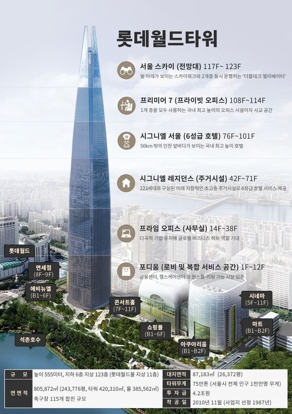 또 롯데 측은 롯데월드몰 및 면세점과의 시너지효과로 약 10조원의 경제효과를 창출할 것으로 기대하고 있다. 업계에서는 롯데월드타워 인근의 관광 수입만 연 8000억원에 이를 것으로 예측하고 있다.