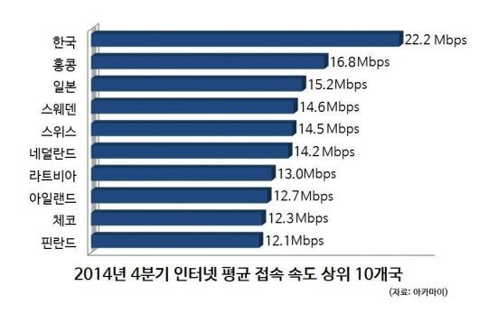 콘텐츠 전송 네트워크(CDN) 분야 글로벌 리더 아카마이코리아는 지난 26일, ‘2014년 4분기 인터넷 현황 보고서’를 통해 우리나라가 22.2Mbps 인터넷 평균 접속 속도로 홍콩(16.8Mbps)과 일본(15.2Mbps)등을 따돌리고 4분기 연속 전세계 1위를 차지했다고 밝혔다. 4.5Mbps로 확인된 전세계 인터넷 평균속도를 감안하면 우리나라의 인터넷 평균 접속 속도는 평균보다 4.9배 빠른 것이다.