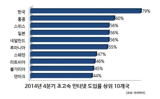 초고속인터넷 도입률에서도 우리나라는 세계 1위 자리를 지켰다. 도입률은 지난 분기 대비 3% 포인트 하락하며 79%로 나타났지만 2위 홍콩(60%)과 여전히 큰 차이를 보였다. 그러나 광대역인터넷(4Mbps 이상의 속도) 도입률은 95%를 기록하며 불가리아(96%)에게 1위 자리를 내줬다.
