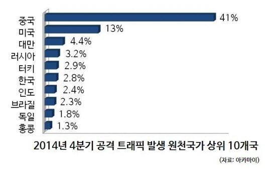 리더 아카마이코리아 측은 199개 국가에서 발생한 공격 트래픽을 분석한 결과 과반수 이상이 아태지역(59%)에서 발생했으며 중국이 41%로 1위를 차지했다고 밝혔다. 미국은 전 분기 대비 무려 20% 가까이 낮아진 13%로 나타난 반면, 우리나라는 전 분기 대비 2배가 증가한 2.8%로 확인됐다. 리더 아카마이코리아는 자사의 고객들이 지난 4분기에 총 327건의 디도스(DDoS) 공격을 받았다고 밝히며 이는 전 분기 비교해 20% 증가한 수치라고 전했다.