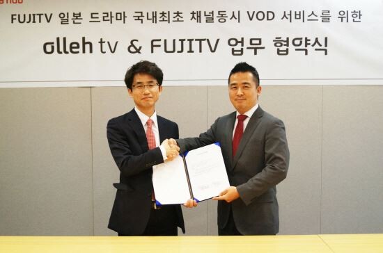 올레tv를 운영하고 있는 KT미디어허브는 후지티비와 15일 오전, 서울 서초구에 위치한 본사 대회의실에서 KT미디어허브 콘텐츠사업본부 강인식 본부장과 후지티비의 하야카와 타카유키 제너럴 프로듀서 등 주요 인사가 참석한 가운데 ‘일본 드라마 국내 최초 채널동시 VOD 서비스를 위한 업무 협약식’을 체결했다.