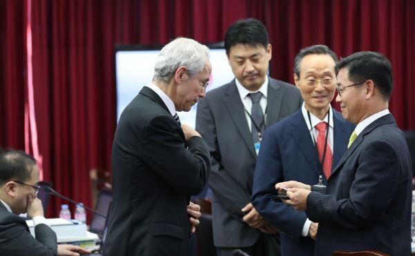 ▲ 지난 7월 20일 오전 정부세종청사 공정거래위원회 심판정에서 열린 퀄컴 인코포레이티드 등의 시장지배적지위남용행위에 대한 1차 전원회의에 도널드 로젠버그 퀄컴 총괄 부사장(왼쪽)이 인사를 나누고 있다. <사진=연합뉴스>