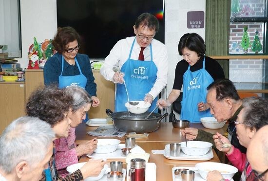 박진회 은행장과 유명순 수석부행장 등 한국씨티은행 임원들은 신년 인사회 후 혜화동성당 데이케어센터를 방문해 새해 첫 봉사활동으로 어르신들에게 떡국을 배식하는 활동에 참여했다.
