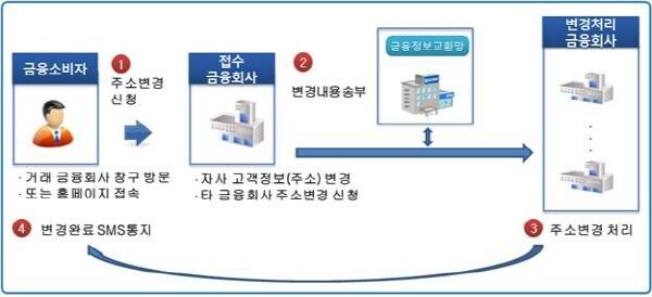 주소변경이 필요한 고객은 거래하는 금융회사 중 한 곳을 선택해 신청하면 된다. 고객은 금융회사로부터 변경결과를 문자로 통지받게 된다.