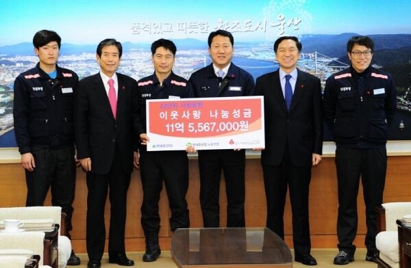 이날 현대중공업은 올해 지역 사회에 10억2300만원을 기부하기로 약속했고 노동조합도 8200만원을 보태기로 했다.