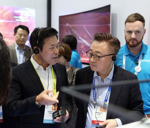 ▲ 미국 라스베이거스 컨벤션센터에서 5일(현지시각) 개막한 'CES 2017'에 차려진 삼성부스에서 박정호 SK텔레콤 사장(왼쪽)과 고동진 삼성전자 무선사업부 사장이 대화를 나누고 있다. <사진=SK텔레콤>