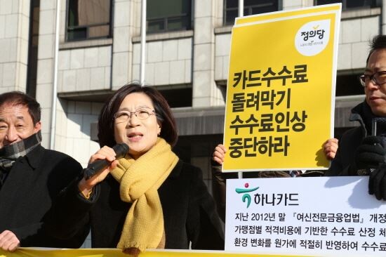 19일 김제남 정의당 의원이 서울 중구 금융위원회 앞에서 카드수수료 인하를 촉구하고 있다. <사진=김제남 의원실>