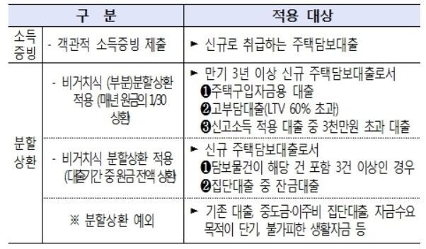 이에 따라 상호금융 등 제2금융권에서 주택담보대출을 신규로 받는 고객은 원리금을 전체 균등 분할 상환해야 한다. 이자만 갚는 거치기간도 1년 이내로 줄어든다. 만약 3년 만기로 1억 원을 대출받을 경우 3년간 매년 원금 333만 원 이상을 다달이 나눠 갚은 뒤 만기 이후 남은 원금 9000만원을 일시 상환하는 형식이다. 다만 의료비·학자금 등 생활자금을 빌리는 경우 등 일부 불가피한 사례에 한해 이자만 내는 거치기간을 길게 둘 수 있게 예외를 둘 방침이다.