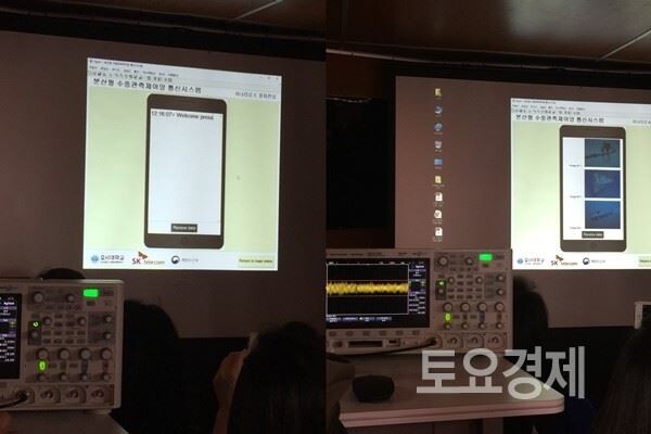 ▲ 지난 30일 호서대 공동연구팀이 수중 무선통신망을 통해 문자(왼쪽)와 사진을 수신하는 모습을 시연하고 있다. <사진=여용준 기자>