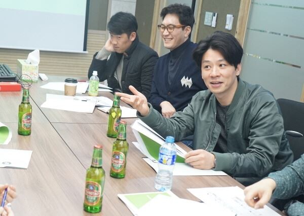 정상훈은 칭따오 광고 제작 관계자들과 사전 아이디어 회의를 갖고 직접 광고제작에 참여한다.