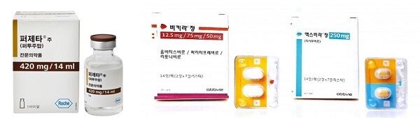 ▲ (왼쪽부터) 로슈의 유방암 표적치료제 퍼제타, 애브비의 만성 C형간염 치료제 비키라·엑스비라정. <사진=각사 제공>