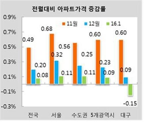 특히 대구는 지난해 11.24%의 높은 연간 상승률을 보였으나 1월 들어 0.15%로 하락했다. 지난 2010년 7월 이후 65개월 연속 상승 행진을 마감한 것이다.