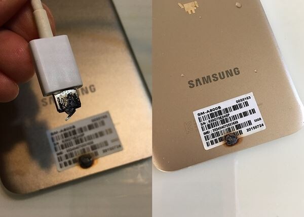 13일 한 온라인 커뮤니티에 올라온 게시글에 따르면 지난 11일 글을 올린 이용자의 동생이 사용하는 갤럭시A8이 충전 중 단자 후면이 새까맣게 타버렸다고 밝혔다.