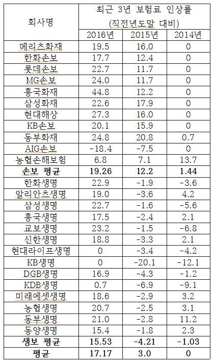 생·손보사 평균 17% 인상