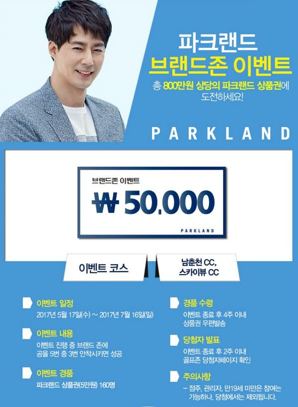 참가 방법은 회원 로그인 후 남춘천CC, 스카이뷰CC 등 2개 CC에서 스트로크 모드로 18홀 라운드를 완료하면 된다. 라운딩 중 총 5회 등장하는 브랜드존에 3번 안착 시 성공이며, 성공 시 파크랜드 상품권(5만원)을 160명에게 경품으로 제공한다.