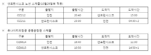 또 오후 12시40분에 출발했던 OZ211(샌프란시스코~인천)편은 오후 11시30분에 샌프란시스코를 출발해 인천에 오전 4시30분에 도착하는 스케줄로 변경된다.