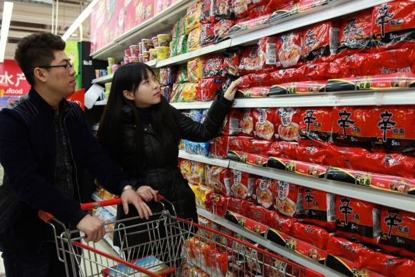 ▲ 중국 상해 한 대형마트에서 신라면을 구매하는 중국 소비자들 모습. <사진=농심>