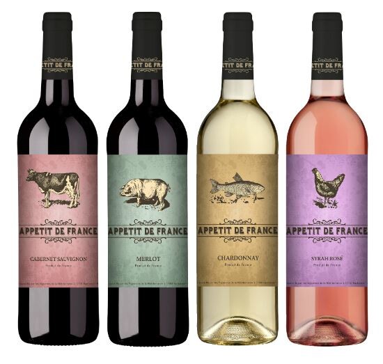 아뻬띠 드 프랑스에는 라벨에 해당 와인과 잘 어울리는 음식의 동물그림이 그려져 있어 소비자들이 좀 더 쉽게 선택할 수 있다. 레드와인 ‘까베르네소비뇽(Cabernet Sauvignon)’은 소, ‘메를로(Merlot)’는 돼지, 화이트와인 ‘샤르도네(Chardonnay)’는 생선, 로제와인 ‘시라(Syrah)’는 닭의 그림이 삽입돼 있다.