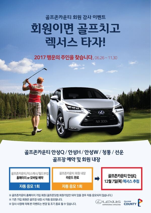 한편 골프존카운티는 지난해 ‘포드 익스플로러’ 1대가 걸린 이벤트를 진행해 고객들의 큰 호응을 얻은 바 있어 올해에는 ‘2017 렉서스 NX300h’ 2대로 경품을 확대했다.