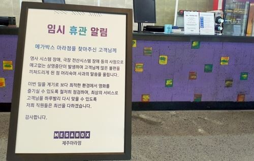 제주아라점은 영화관 입구 등에 붙인 임시휴관 공지를 통해 “영사 시스템 장애, 극장 전산 시스템 장애 등의 사정으로 예고없는 상영 중단이 발생했다. 불편을 끼쳐 죄송하다”고 밝혔다.