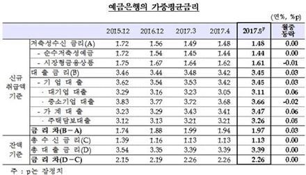이처럼 대출금리가 전반적으로 올랐으나 예금금리에는 변화가 없었다. 5월 신규 저축성수신 금리는 1.48%였다. 정기 예‧적금 등 순수저축성 예금 금리가 전월과 같은 1.44%로 집계됐다. 양도성예금증서(CD) 등 시장형금융상품 금리는 0.01%포인트 하락한 1.61%를 나타냈다. 이에 신규 취급액 기준 대출 금리와 수신금리 차이는 1.97%포인트로 한 달 새 0.03%포인트 벌어졌다.