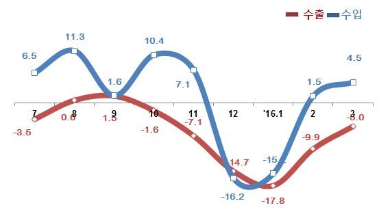 수출은 글로벌 수요 침체와 최대 수출국인 중국의 경기 둔화 등으로 6개월째 감소세를 보였으나 1월 이후 감소율이 완화되고 있는 것으로 나타났다.