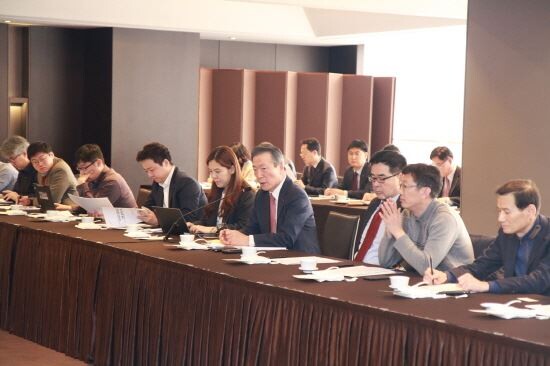 ▲ 25일 서울 플라자호텔 메이플홀에서 열린 신년 기자간담회에서 이수창 생명보험협회 회장(우측에서 네 번째)이 혁신과 경쟁 패러다임을 통한 생보업계 질적성장 유도를 주제로 설명하고 있다. <사진=생명보험협회>