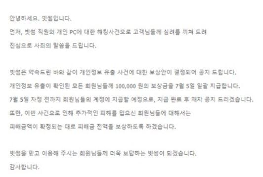 빗썸 관계자는 “빗썸을 믿고 이용해주는 회원들에 대한 도의적 책임으로 내린 결정으로 이는 실제 법원이 대기업들의 개인정보유출 사고에 대해 배상을 명한 피해보상 수준과 동일하다”고 말했다.