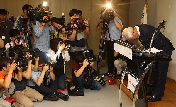 ▲ '갑질논란'으로 검찰의 수사 선상에 오른 미스터피자 창업주 정우현 MP그룹 회장이 지난달 26일 오후 서울 서초구 방배동 사옥에서 가진 기자회견에서 고개숙여 인사하고 있다. 정 회장은 이날 기자회견에서 회장직 사퇴를 발표했다. <사진=연합>