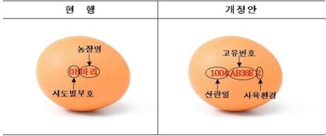 난각 표시 사항은 기존 08마리처럼 시도별 부호·농장 명을 쓰던 것에서 산란 일자·생산자 고유번호·사육환경번호를 표시하도록 바뀐다. 난각 표시는 앞에서부터 산란 일, 생산농장, 사육환경을 나타낸다. 사육환경은 유기농(1), 방사 사육(2), 축사 내 평사(3), 케이지사육(4) 등 번호로 구분해 표시된다.
