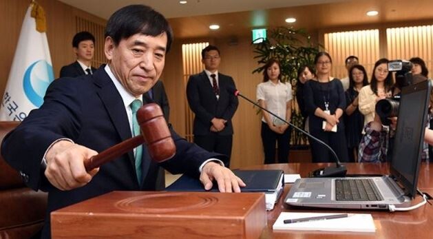 ▲ 이주열 한국은행 총재가 13일 오전 서울 중구 한국은행에서 금융통화위원회 시작을 알리는 의사봉을 두드리고 있다. <사진=연합뉴스>